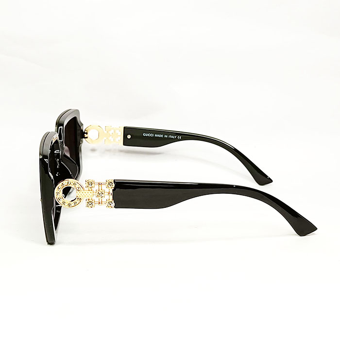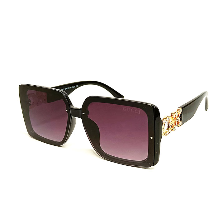 A pair of black sunglasses with a gold Gucci logo on the temples. The sunglasses have a rectangular frame with a black gradient lens, giving them a sleek and stylish look. The temples are adorned with a small, intricate gold chain, adding a touch of elegance to the overall design. the arms of the sunglasses are thin and black, with the iconic "GUCCI" logo prominently displayed on the front. the lenses are a deep, rich purple, reflecting the light and creating a subtle glow on the frame