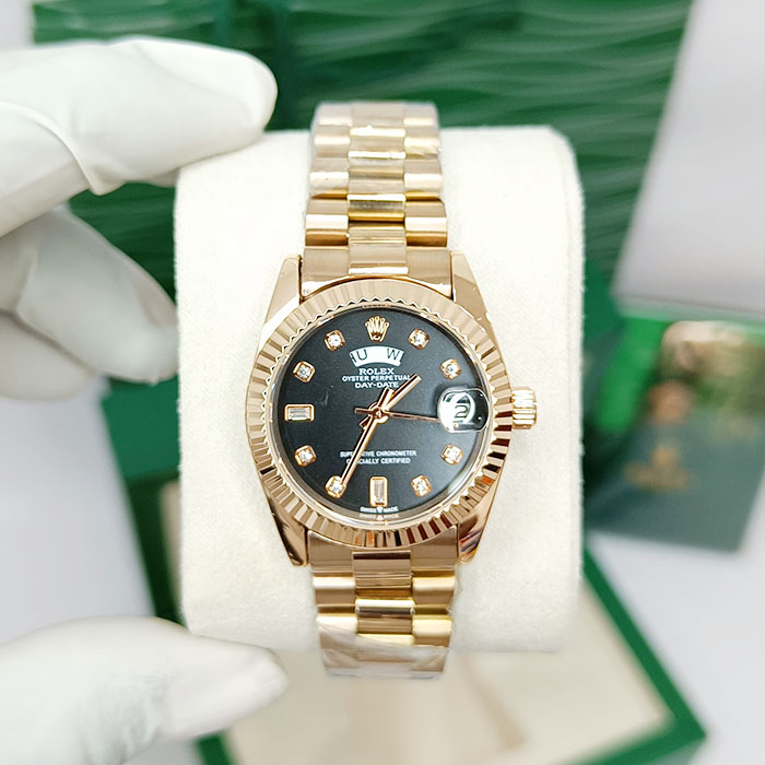 Elevate your wristwear with the timeless sophistication of the Rolex Day-Date Oyster Perpetual. Crafted in polished rose gold, this iconic watch features a bold black dial adorned with luminous diamond hour markers, offering a striking contrast that radiates elegance.