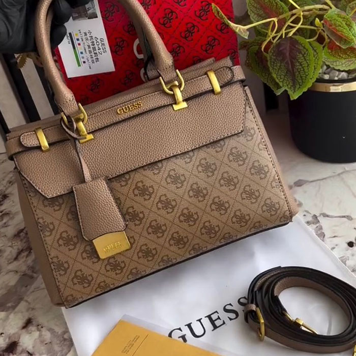 Add a touch of sophistication to your everyday look with the GUESS Kamryn Satchel Handbag. Crafted with premium faux leather, this elegant handbag features a textured upper flap and a monogrammed body adorned with the iconic GUESS logo print. The bag is enhanced with gold-tone hardware, including a detachable logo tag and secure buckle accents, giving it a refined yet bold finish.