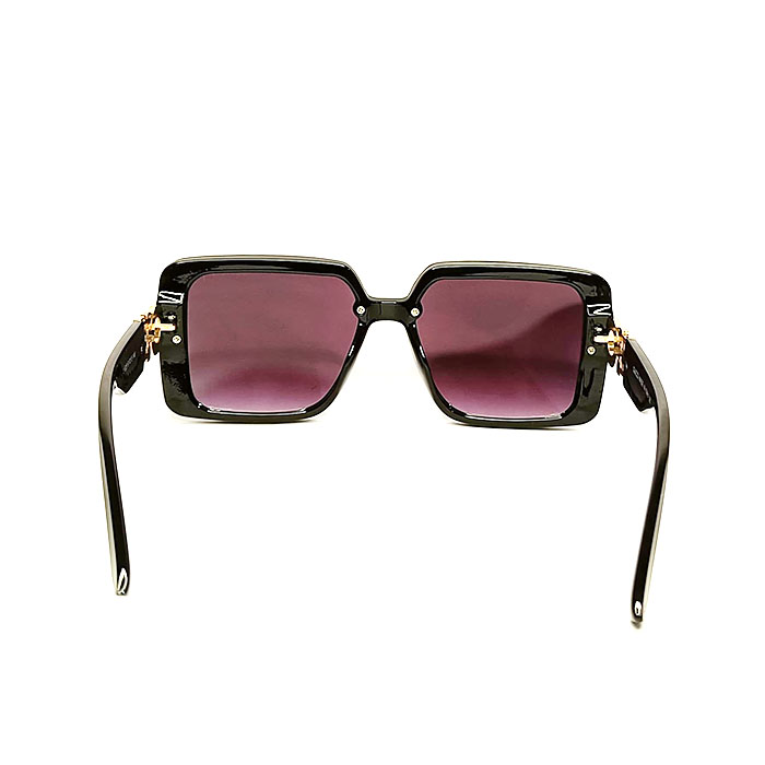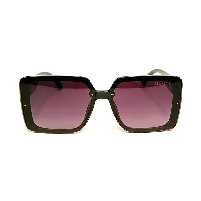 A pair of black sunglasses with a gold Gucci logo on the temples. The sunglasses have a rectangular frame with a black gradient lens, giving them a sleek and stylish look. The temples are adorned with a small, intricate gold chain, adding a touch of elegance to the overall design. the arms of the sunglasses are thin and black, with the iconic "GUCCI" logo prominently displayed on the front. the lenses are a deep, rich purple, reflecting the light and creating a subtle glow on the frame
