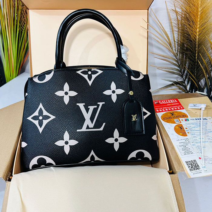 Elevate your style with this elegant Louis Vuitton handbag, crafted from premium monogram canvas in a timeless black and white palette. Featuring the iconic LV logo and floral motifs, this structured bag offers both luxury and practicality. Its smooth leather handles, gold-tone hardware, and attached branded tag exude sophistication. The spacious interior ensures its perfect for daily use or special occasions, seamlessly blending fashion with function.
